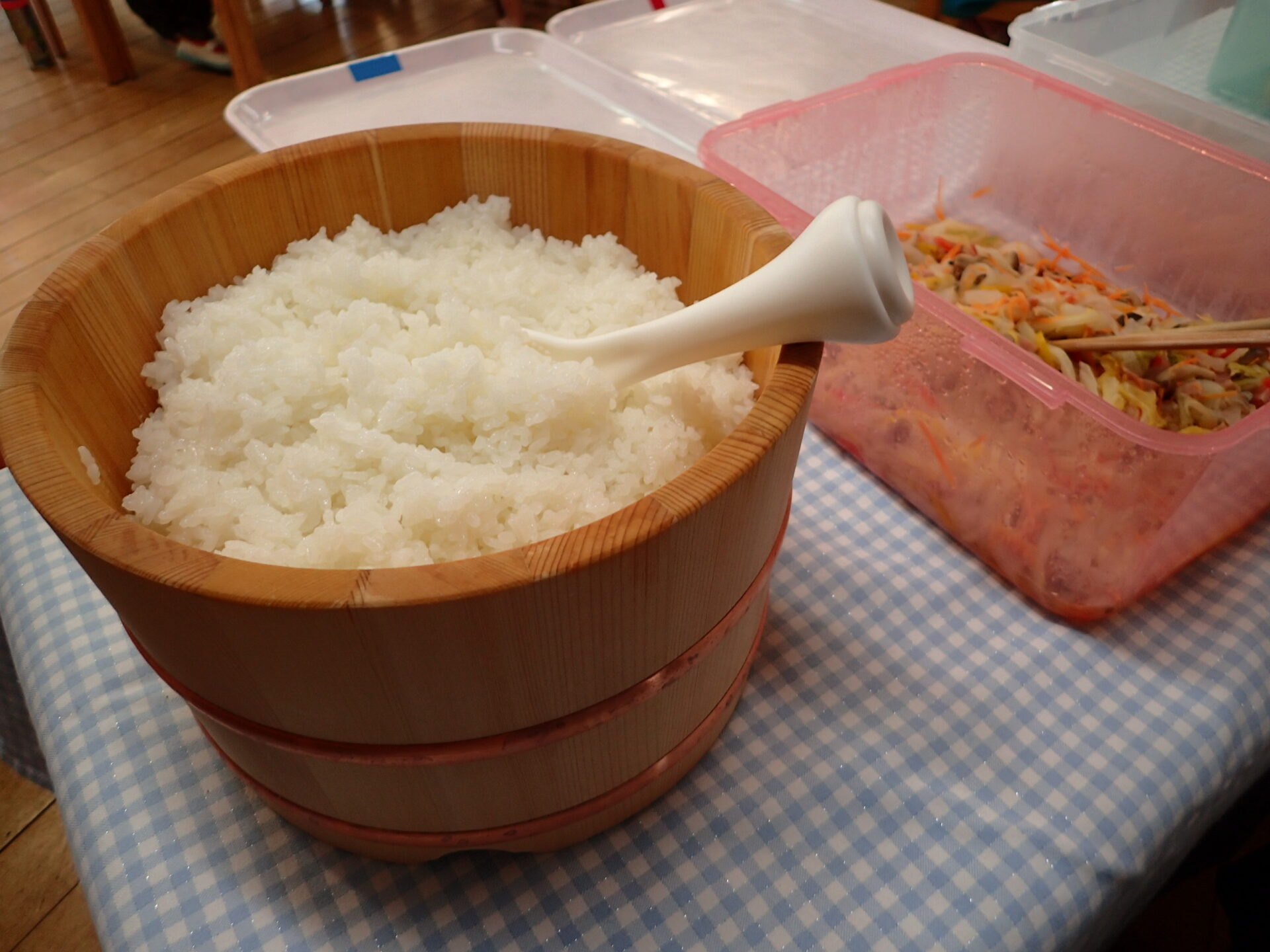 - ・テーブルを並べ、机を拭いて、各自のお弁当の準備