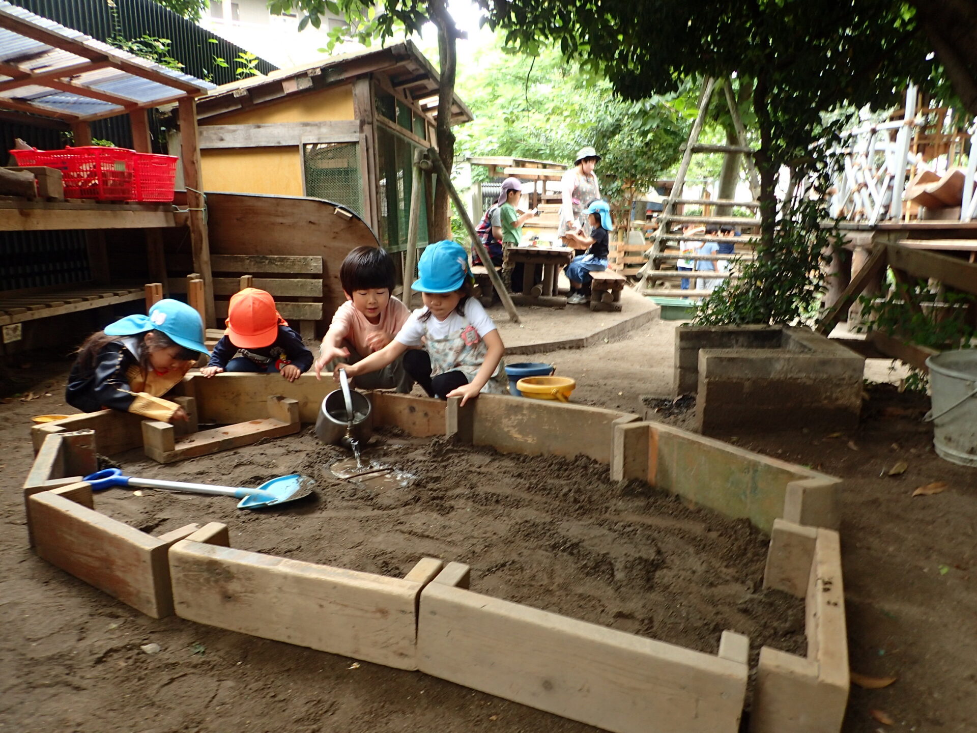 保育が終わった後も、それぞれの必要に応じて楽しみを見つけることができます。あずかり保育は、毎日15名ほどの子どもたちが室内で手作業を楽しみ、園庭の様々な場所で遊びを広げ18時まで仲間とゆったり過ごします。