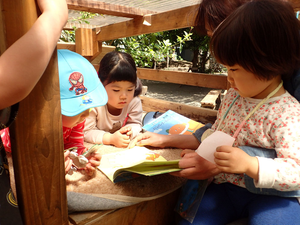 | 内容 | 1.朝のお集まり朝のあいさつ・絵本を楽しむ・毎月の制作 2.園庭やお部屋での活動園庭散策・動植物とのふれあい・砂遊び・絵具遊び・水遊び・虫探し 3.帰りのお集まり着替え・絵本を楽しむ・帰りのあいさつ