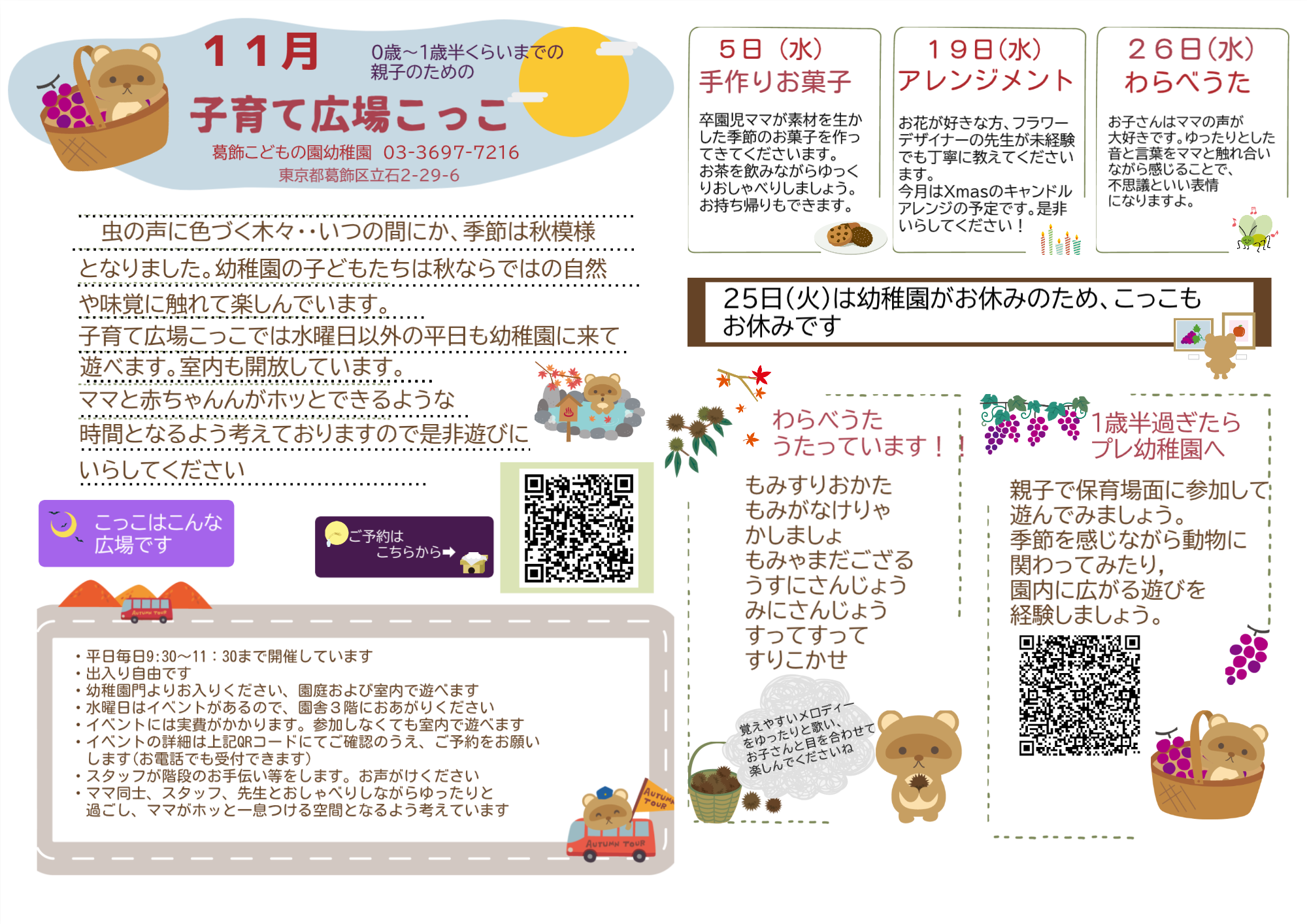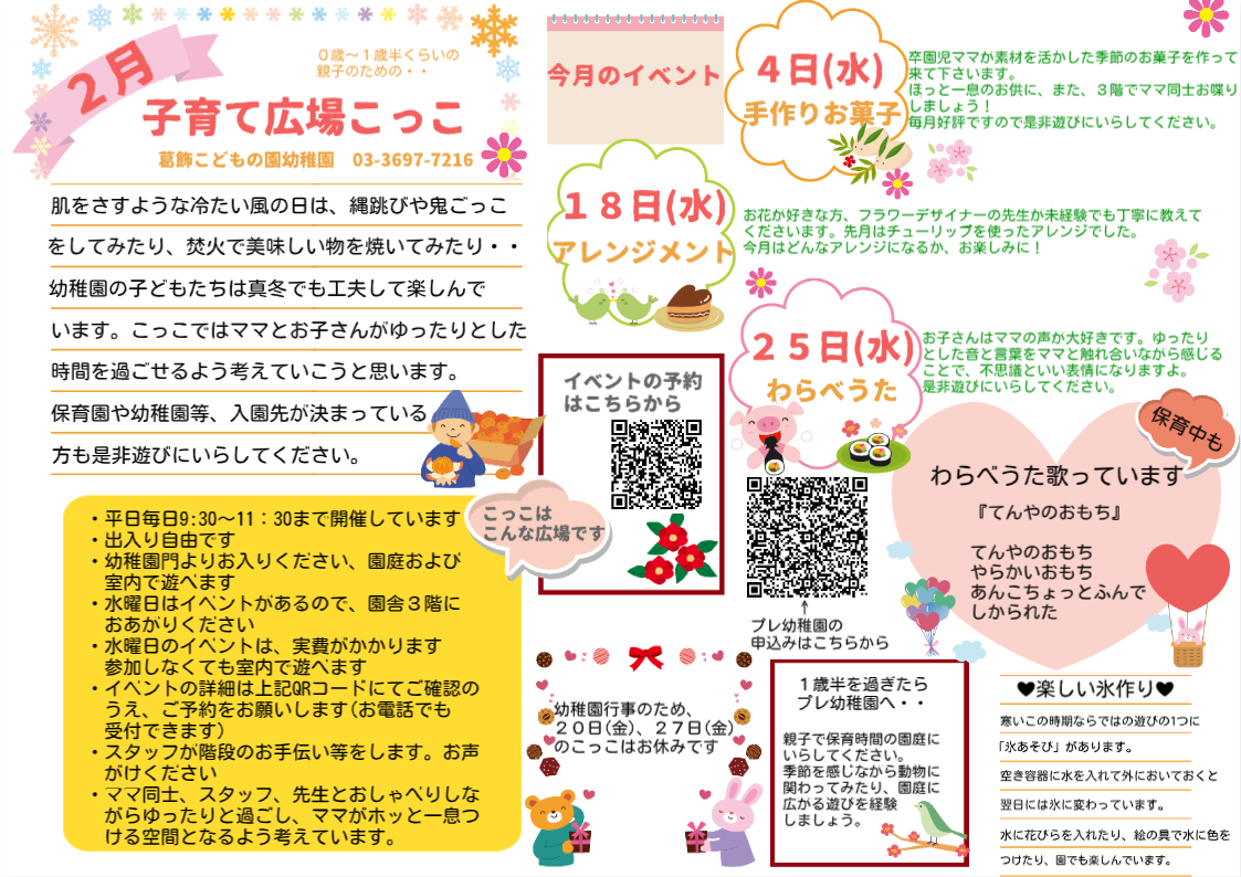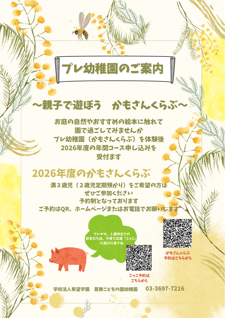 | 場所 | 月・火・木・金曜:幼稚園門よりお入りください 水曜:葛飾こどもの園幼稚園3階 |