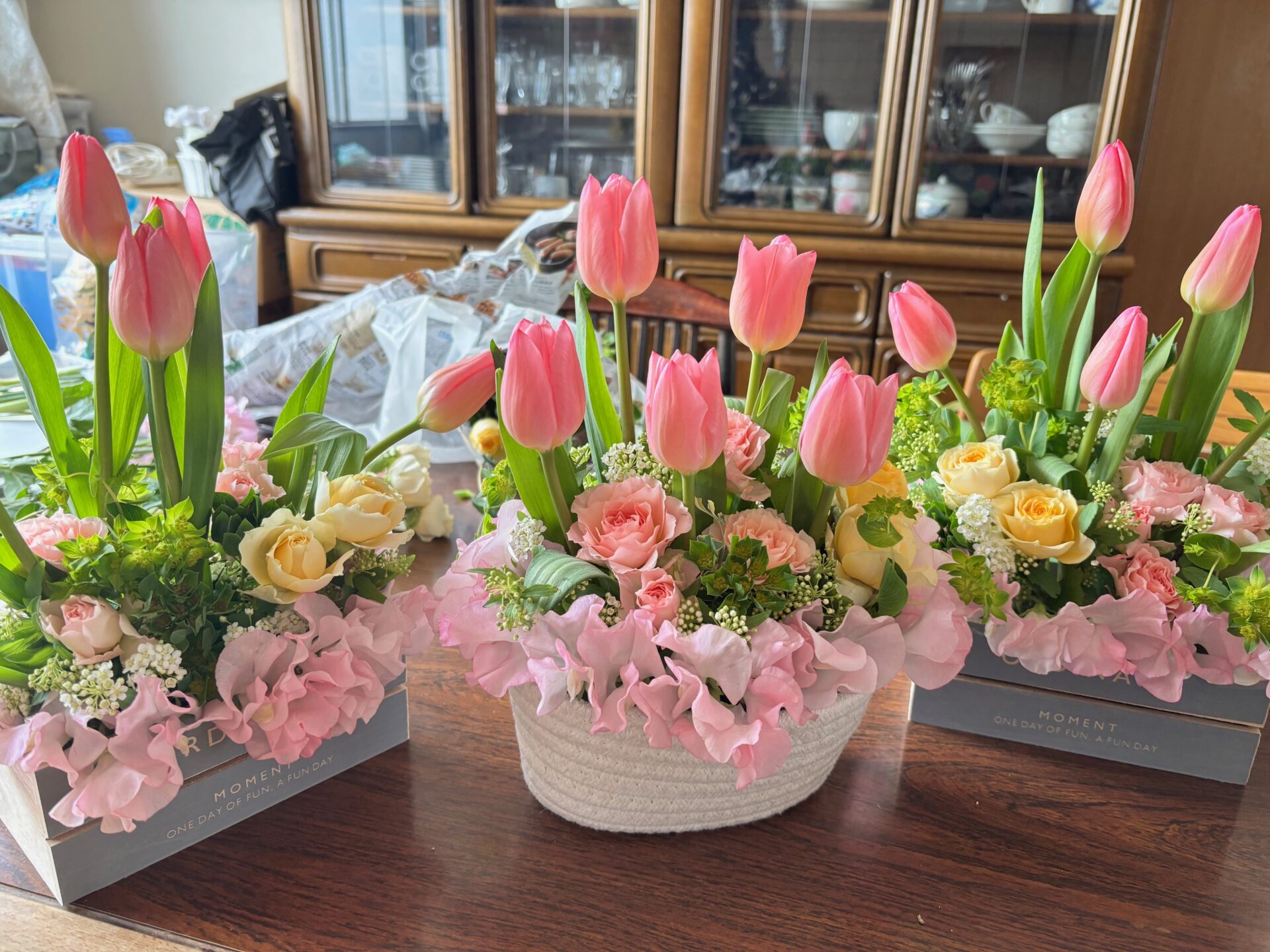 - ・テーブルを並べ、机を拭いて、各自のお弁当の準備