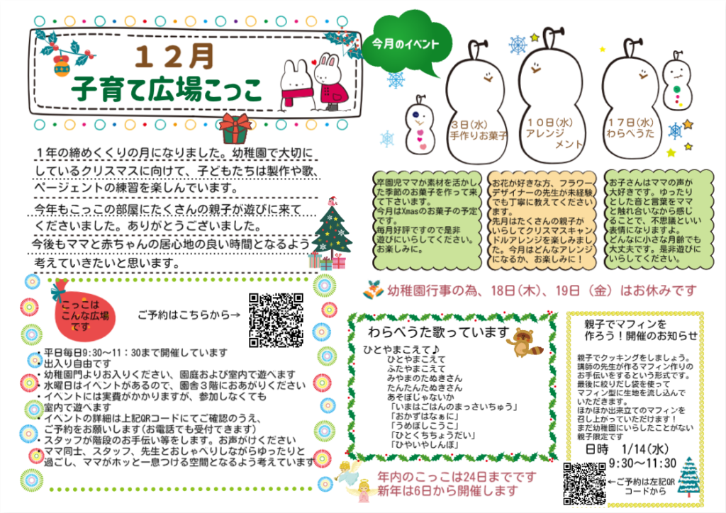 子育て広場こっこ 12月の予定 – 自分らしく育つ園|葛飾こどもの園幼稚園(東京都葛飾区)
