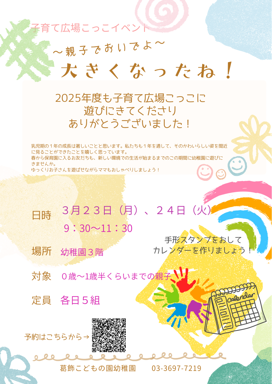 • ※お誕生月までは特別保育となり、翌月より通常保育となります。11月1日(土) 午前8時より 2026年4月5月入園者受付いたします。